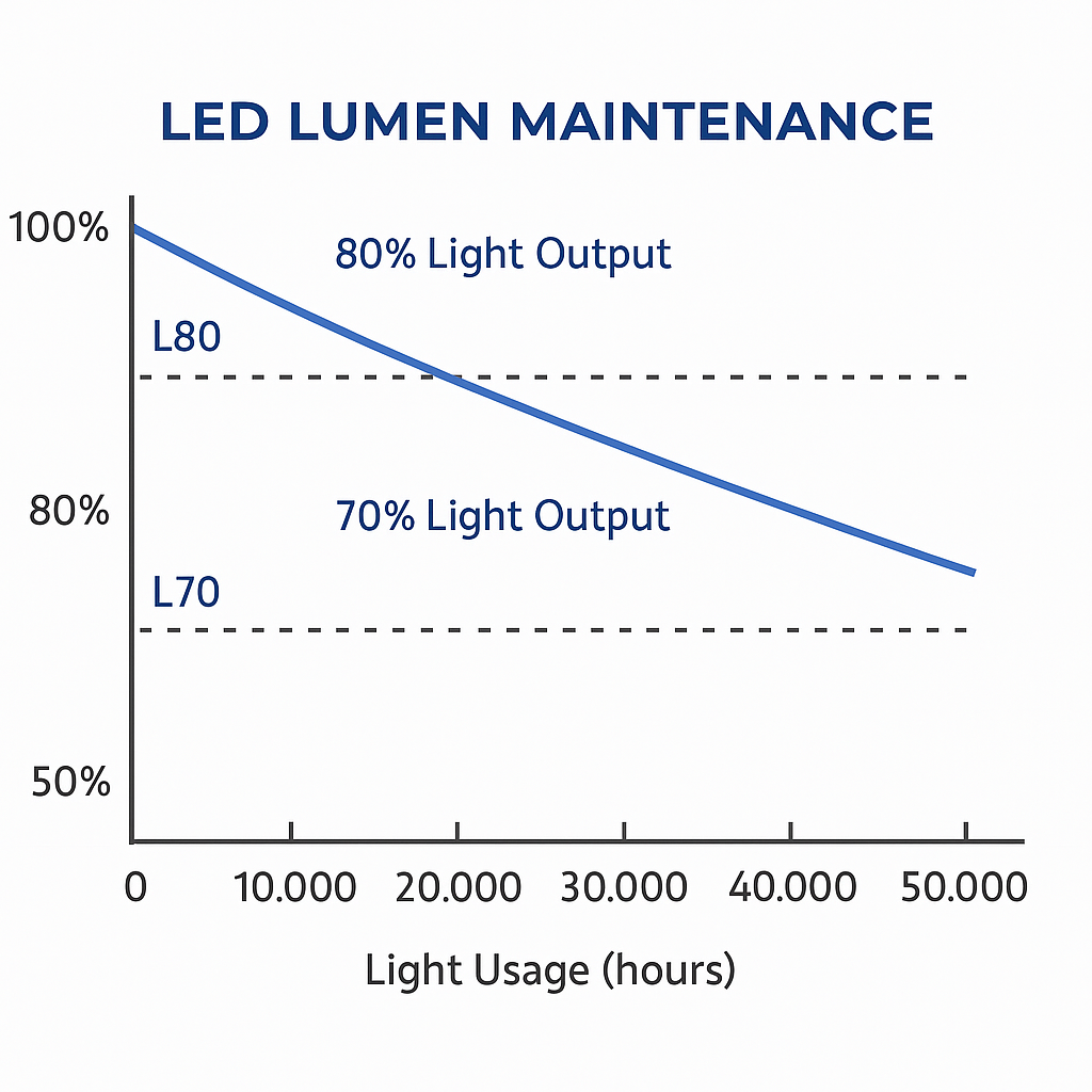 When talking about LED lighting, people often see terms like L80B10 or L70B50, especially when checking product lifetime or warranty. But what do they really mean? Here’s a simple explanation.